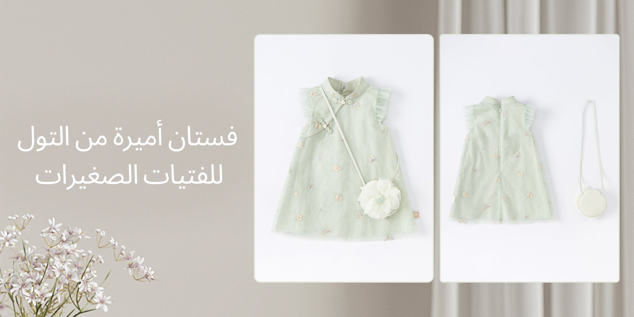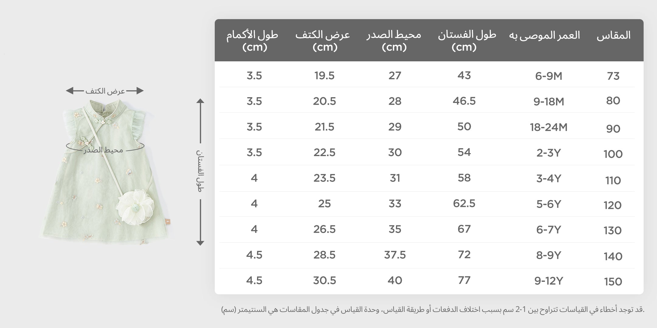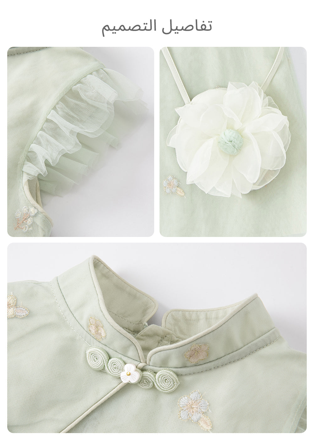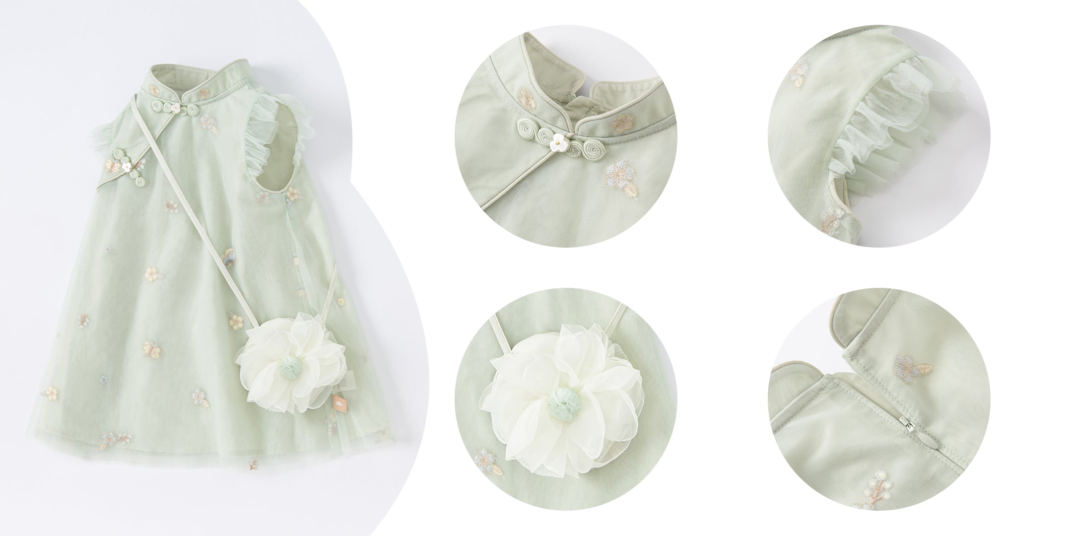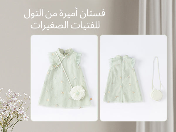 فستان صيفي للفتيات باللون الأخضر مزخرف بالزهور بتصميم حرف A بدون أكمام (يشمل حقيبة عابرة للكتف)