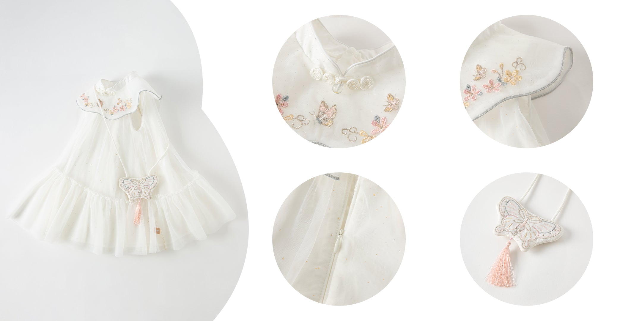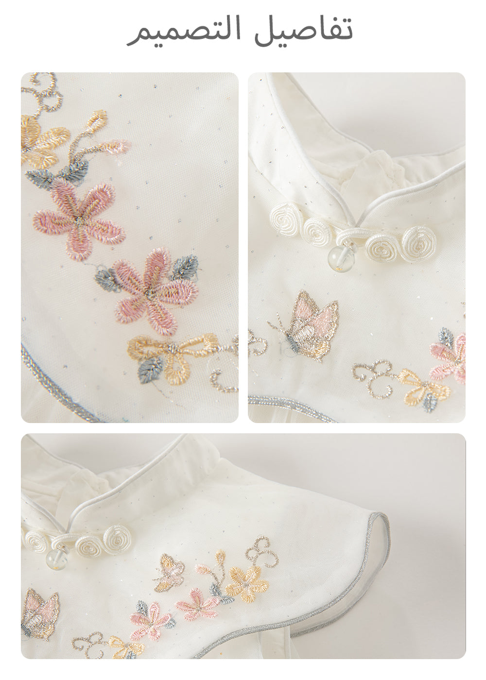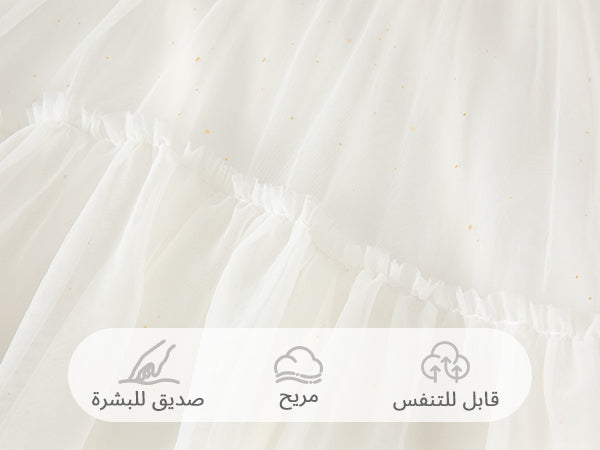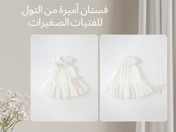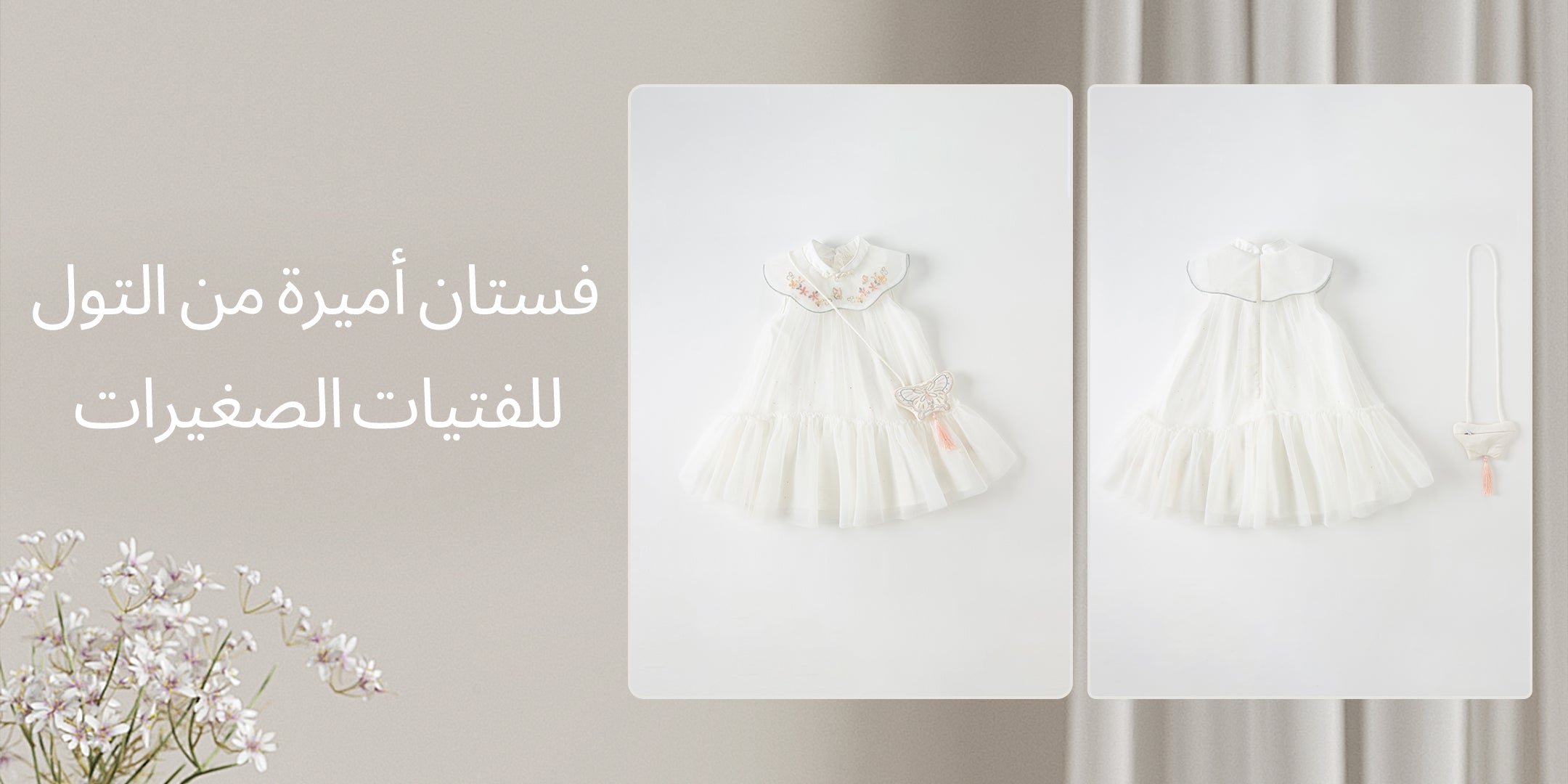 فستان شبكي أبيض صيفي للفتيات مع تطريز ووشاح كتف زخرفي (يشمل حقيبة كروس)