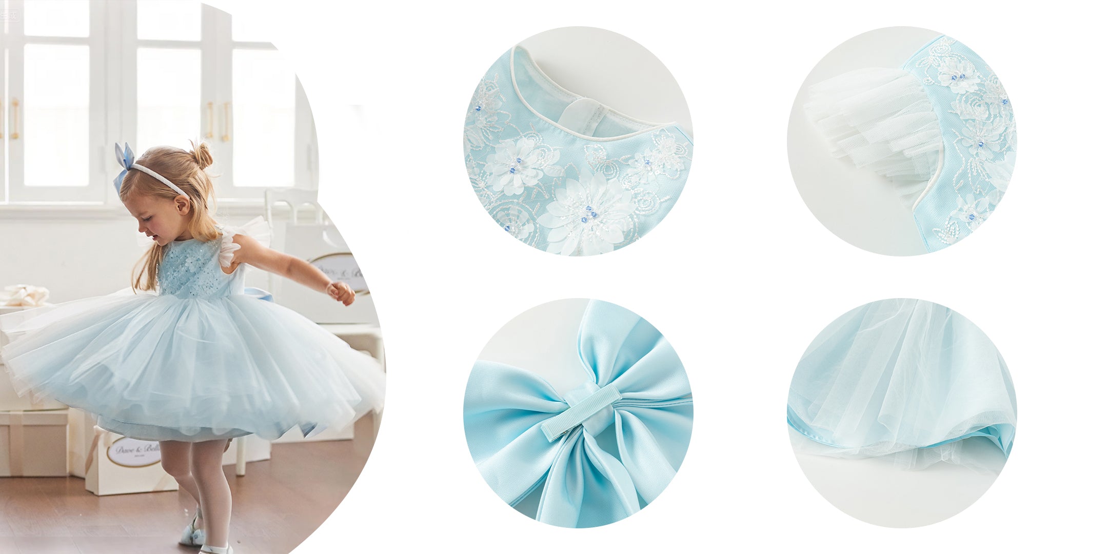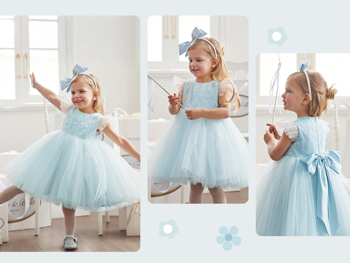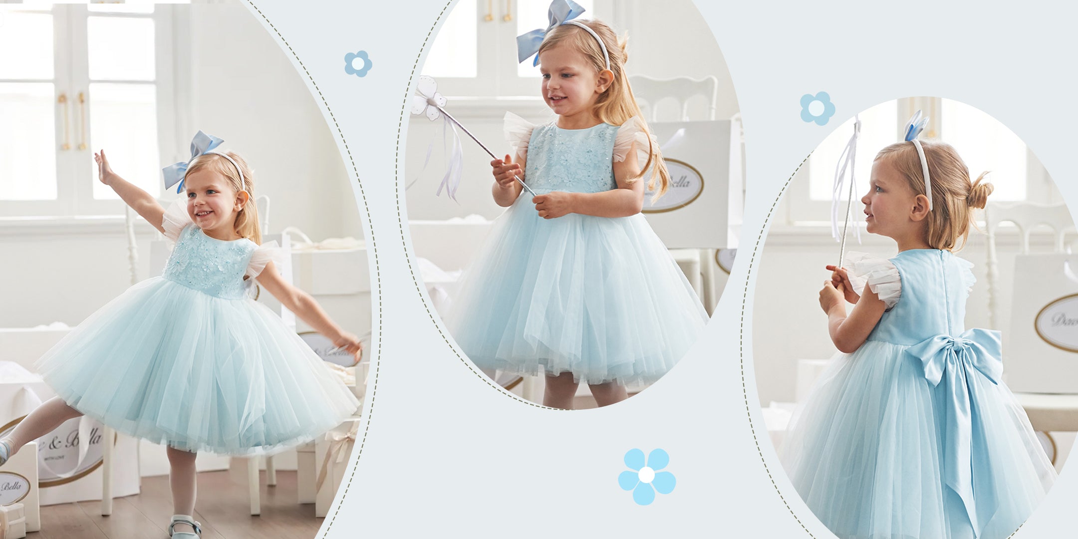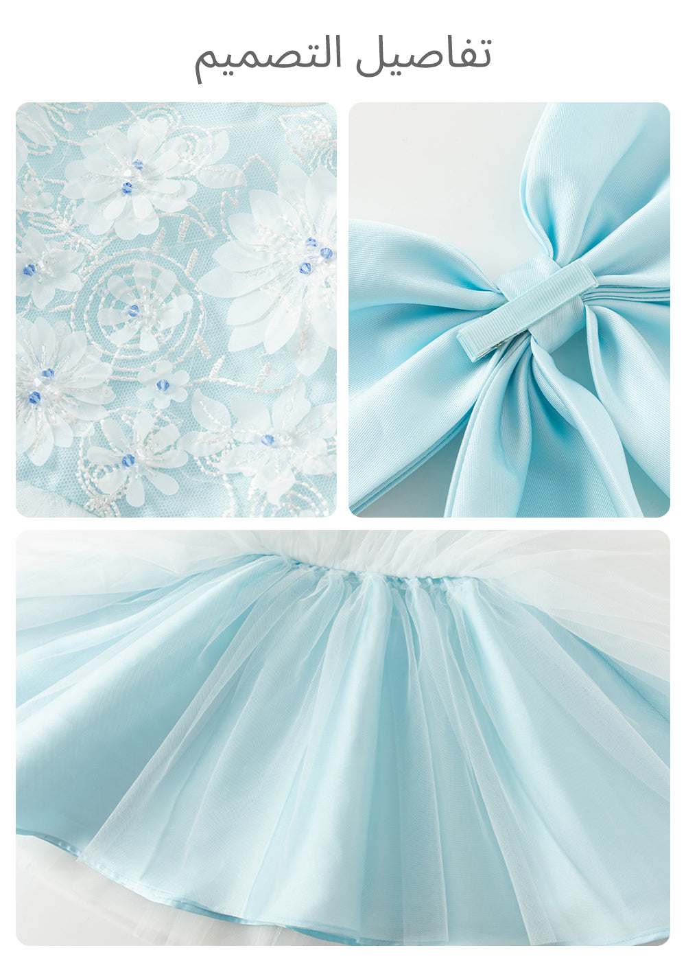 فستان صيفي للبنات الصغيرات بدون أكمام من التول الأزرق مزين بعقدة قابلة للإزالة بتصميم أنيق