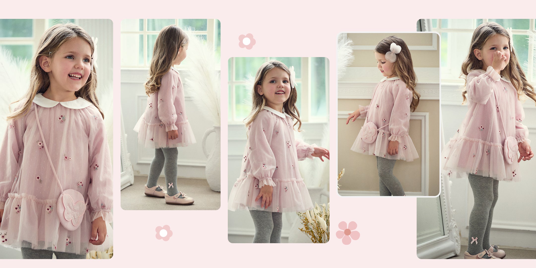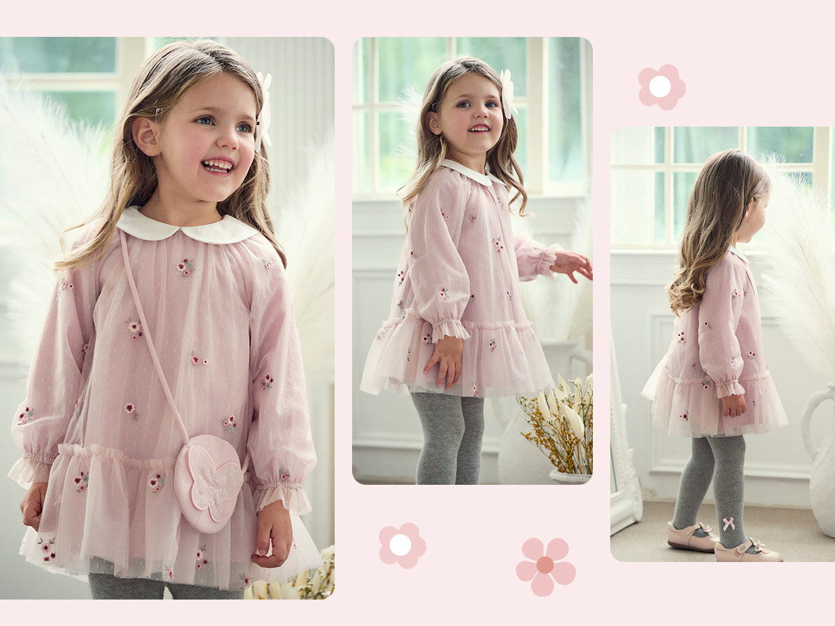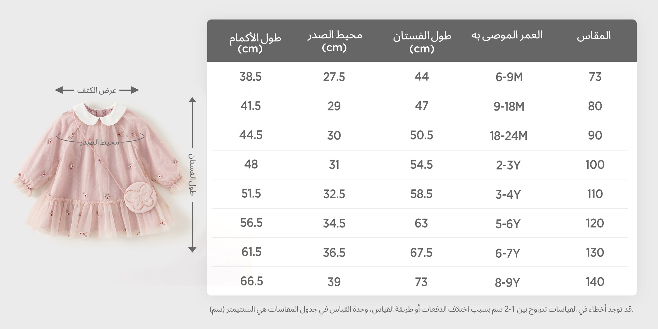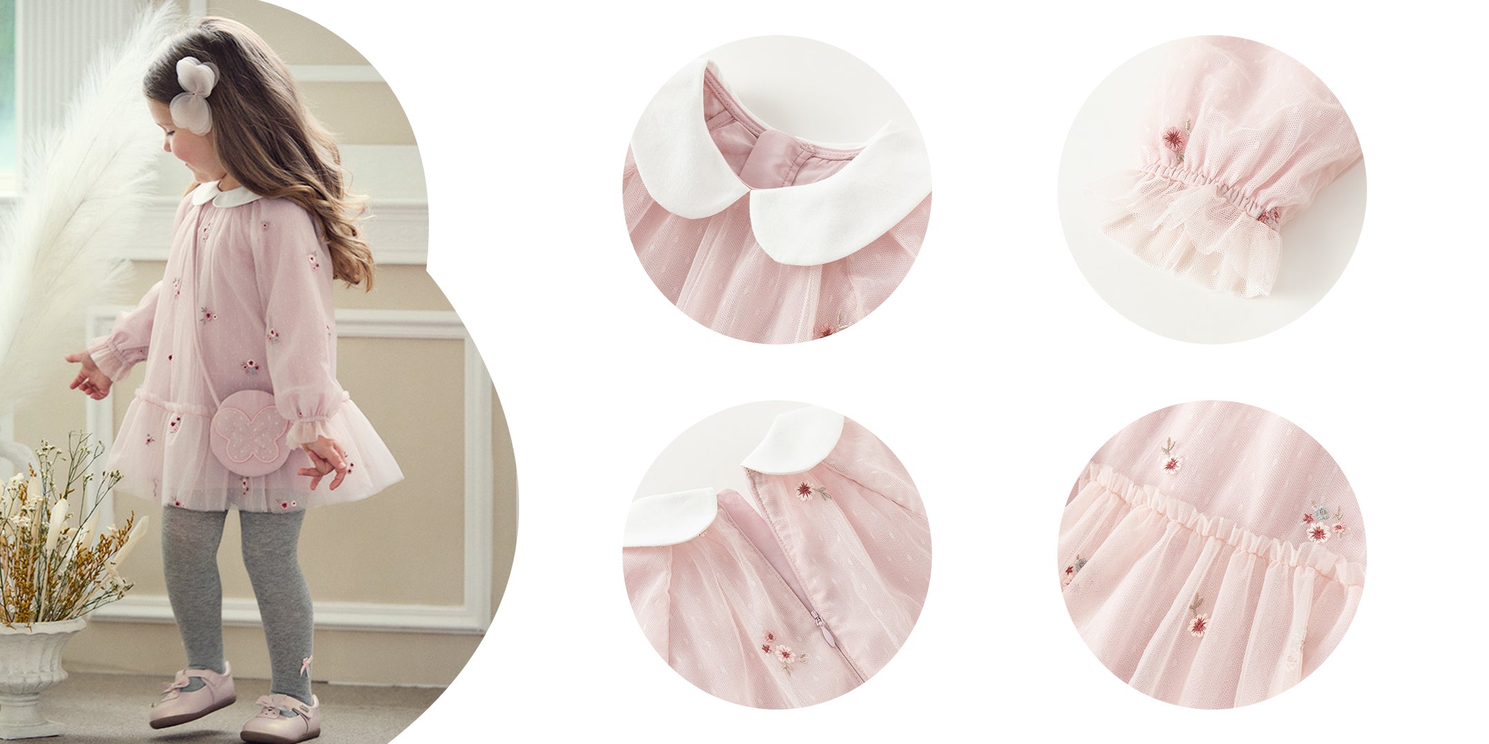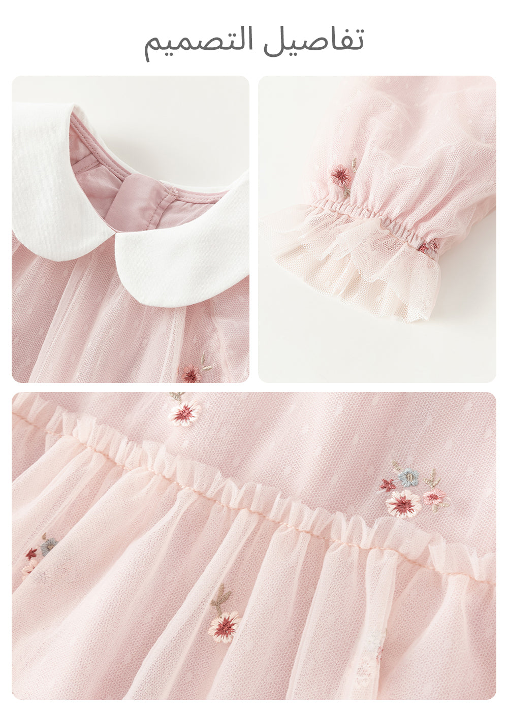 فستان للبنات الصغيرات بأكمام طويلة من التول الوردي بتصميم أنيق مزين بتطريز زهور (يشمل حقيبة كروس)